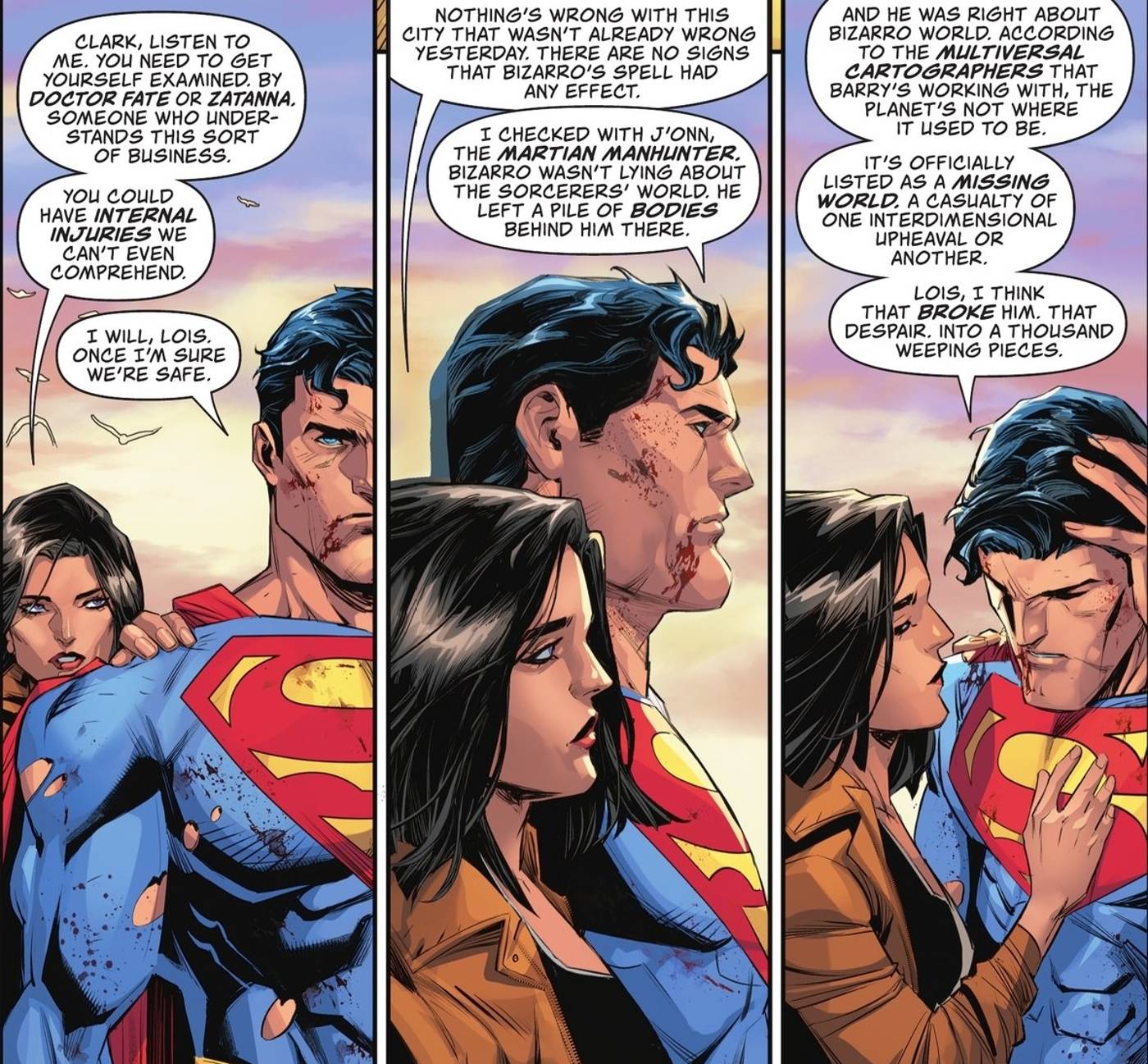 Approximately six weeks later, Bizarro confronts Superman, conveying the distressing news that Bizarro World, the distorted mirror image of Earth, has disappeared. Bizarro attributes this catastrophic event to the endless series of Crises and cataclysms that have plagued the multiverse since the original Crisis on Infinite Earths. The ensuing clash between Superman and Bizarro offers only a glimpse into the broader repercussions that this multiverse-spanning failure is causing.
